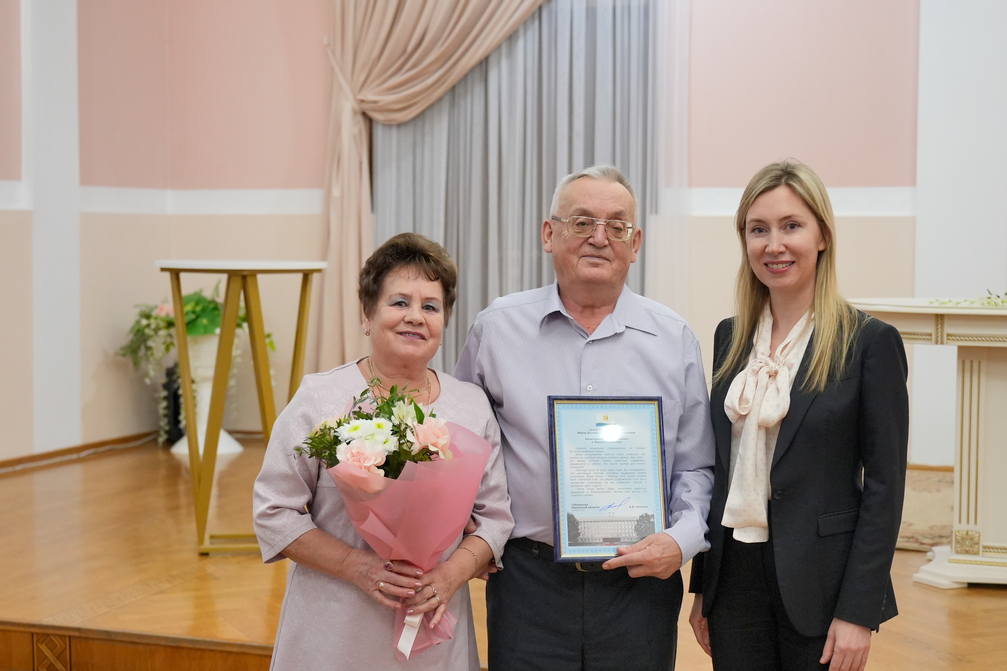 Вчера, 17 декабря, во Дворце бракосочетания города Кирова по доброй традиции состоялось ежегодное торжественное мероприятие «Бал юбиляров». В розовом зале собрались семейные пары, отметившие в этом году 50, 55 и 60 лет совместной жизни.