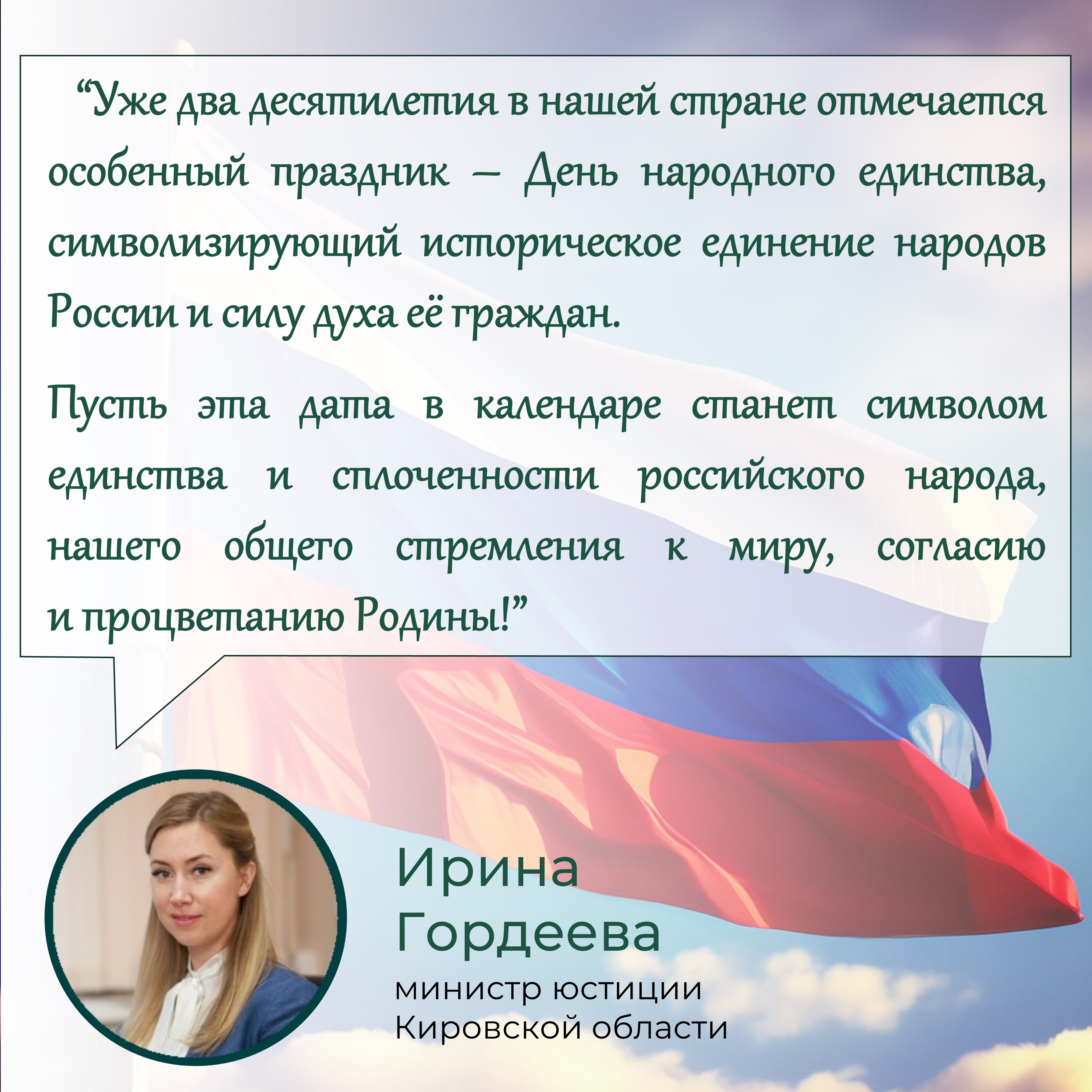 "Уже два десятилетия в нашей стране отмечается особенный праздник – День народного единства, символизирующий историческое единение народов России и силу духа её граждан.